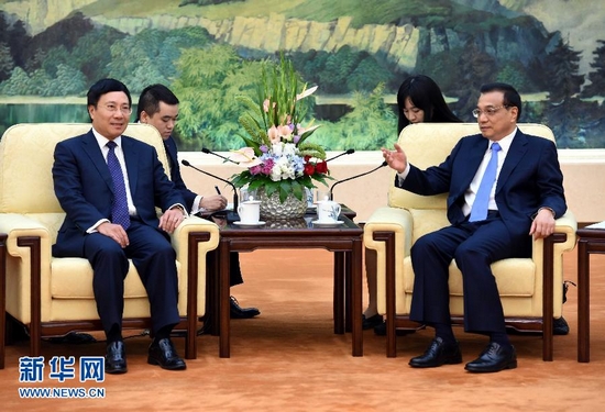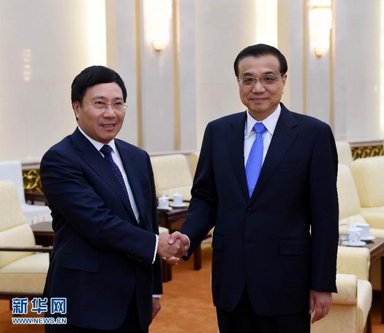 6月18日,国务院总理李克强在北京人民大会堂会见来华共同主持中越双边合作指导委员会第八次会议的越南副总理兼外交部长范平明。 新华社记者饶爱民 摄