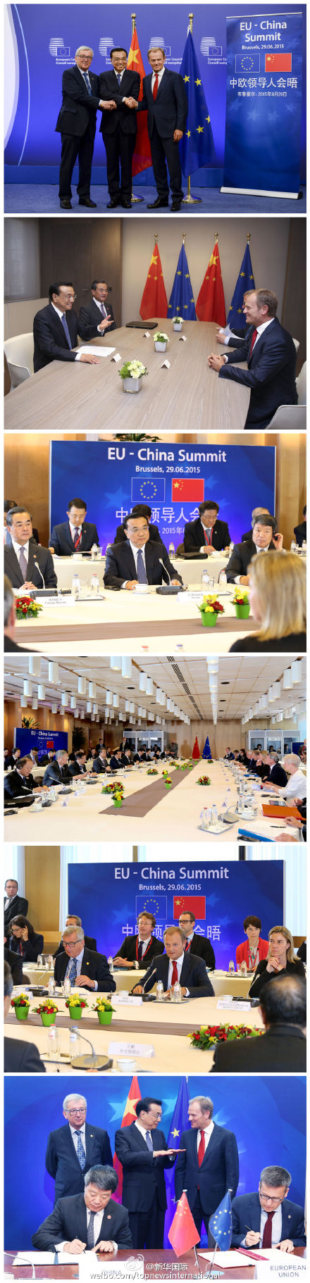新华社北京6月30日电 据新华社“新华国际”微博报道,29日下午,第17次中欧领导人会晤在布鲁塞尔举行,李克强总理同欧洲理事会主席图斯克、欧盟委员会主席容克共同主持。会晤取得重要成果,发表了会晤联合声明和关于气候变化的联合声明,在科技、知识产权、区域政策、海关等领域签署多项合作文件,就广泛议题达成共识。