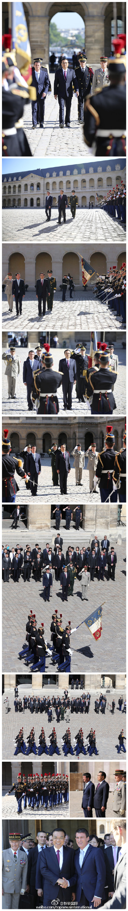 新华社北京7月1日电 据新华社“新华国际”微博报道,当地时间30日上午,法国总理瓦尔斯在荣军院举行隆重仪式,欢迎李克强总理访法。明媚的阳光下,50人方阵的军乐队高奏中法两国国歌,雄壮的《义勇军进行曲》和激昂的《马赛曲》响彻荣军院上空。随后,仪仗队举行分列式,接受中国总理李克强的检阅。