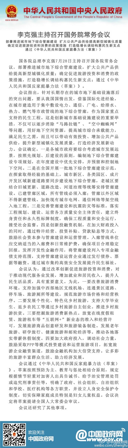 【李克强主持召开国务院常务会议】国务院总理李克强7月28日主持召开国务院常务会议,部署推进城市地下综合管廊建设,扩大公共产品供给提高新型城镇化质量;确定促进旅游投资和消费的政策措施,打造稳增长调结构惠民生新支点;通过《中华人民共和国反家庭暴力法(草案)》。