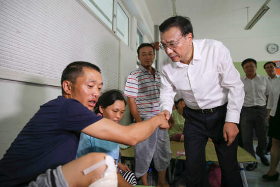 “你是哪里人?怎么受的伤?同伴有没有消息?”16日下午,李克强总理在天津泰达第二小学受灾群众安置点内,躬下身与一名正躺在床上的外来务工者交流。在临时医疗室,他关切询问正在换药的伤员愈合情况如何。总理说,党和政府会全力帮助你们渡过难关,重建生活。