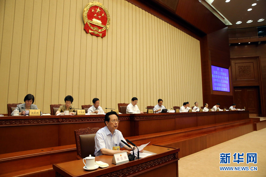 8月27日,十二届全国人大常委会第十六次会议在北京人民大会堂举行第二次全体会议。张德江委员长出席。这是全国人大常委会副委员长陈昌智代表执法检查组向会议作关于检查水污染防治法实施情况的报告。新华社记者刘卫兵摄