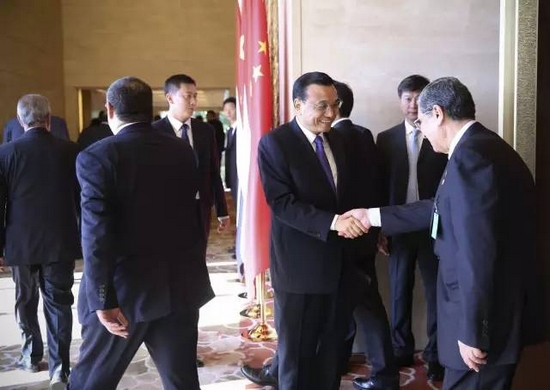 李克强总理与塞尔维亚代表团成员握手,右一为塞尔维亚总统尼科利奇