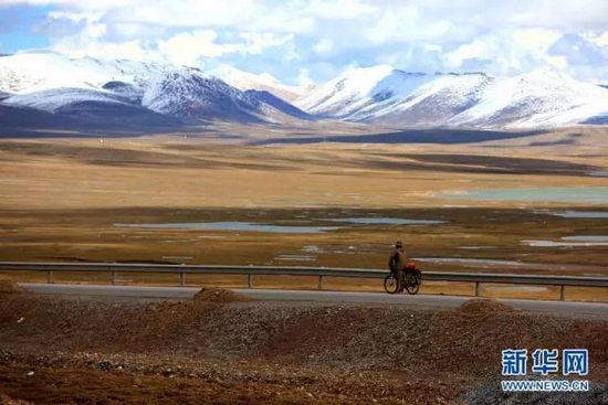 骑行者在青藏公路唐古拉山段驻足欣赏风景。新华社发