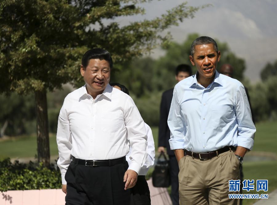 资料图片:2013年6月8日上午,中国国家主席习近平同美国总统奥巴马在美国加利福尼亚州安纳伯格庄园举行第二场会晤。会晤开始前,习近平和奥巴马在风光秀丽的庄园内散步,在轻松的气氛中交谈。新华社记者 兰红光 摄