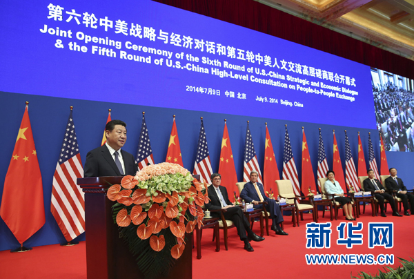 2014年7月9日,第六轮中美 战略与经济对话和第五轮中美人文交流高层磋商联合开幕式在北京举行。国家主席习近平出席开幕式并致辞。新华社记者庞兴雷 摄