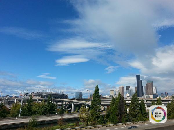 蓝天白云下的西雅图街景。新华社记者李建敏摄