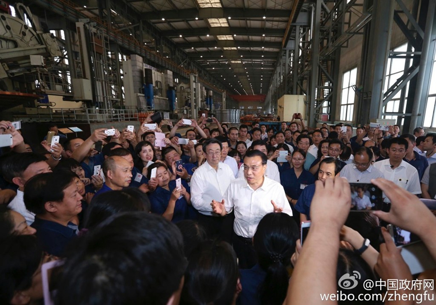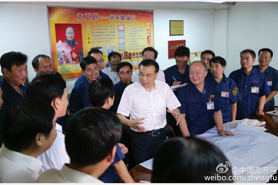 李克强说,“双创”既是小微企业生存之路,又是大企业繁荣兴盛之道。希望工人、技术人员和社会创客群通过“互联网+”推动中国品牌、装备走向世界,展现竞争力,创出中国金字招牌。