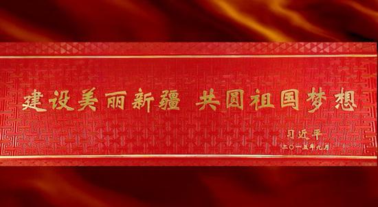 贺匾蔚为大观,以鲜艳的中国红为底色,正面是习近平总书记“建设美丽新疆 共圆祖国梦想”的题词,背面是维吾尔、哈萨克、蒙古、柯尔克孜4种少数民族文字对习近平总书记题词的翻译。芳尊庄重华丽,以石榴籽、石榴花、牡丹、雪莲、栀子花等图案组成,采用景泰蓝工艺制作。