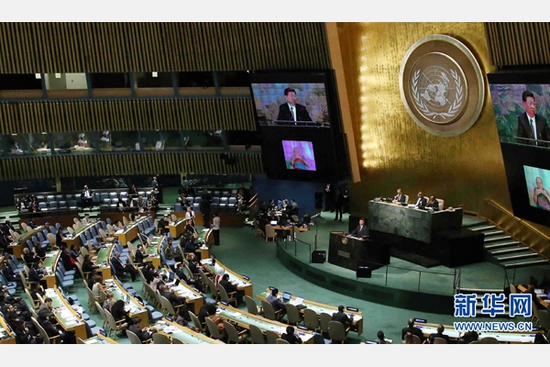 9月26日,国家主席习近平在纽约联合国总部出席联合国发展峰会并发表题为《谋共同永续发展 做合作共赢伙伴》的重要讲话。新华社记者 马占成 摄