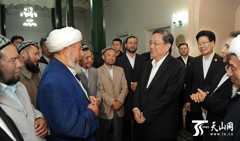 俞正声充分肯定宗教爱国人士为维护新疆特别是南疆稳定作出的重要贡献。他说,宗教工作在新疆是事关社会稳定和长治久安的大事。要积极引导广大宗教爱国人士敢于发声亮剑,弘扬正信、反对极端,在促进民族团结和宗教和顺方面发挥模范带头作用。宗教人士代表纷纷表示,一定积极促进宗教与社会主义社会相适应,争做“五好”宗教人士、争创“五好”宗教场所,珍惜现在安定的社会局面,像爱护自己的眼睛一样爱护民族团结。