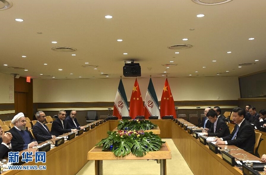 9月28日,国家主席习近平在纽约会见伊朗总统鲁哈尼。 新华社记者李学仁 摄