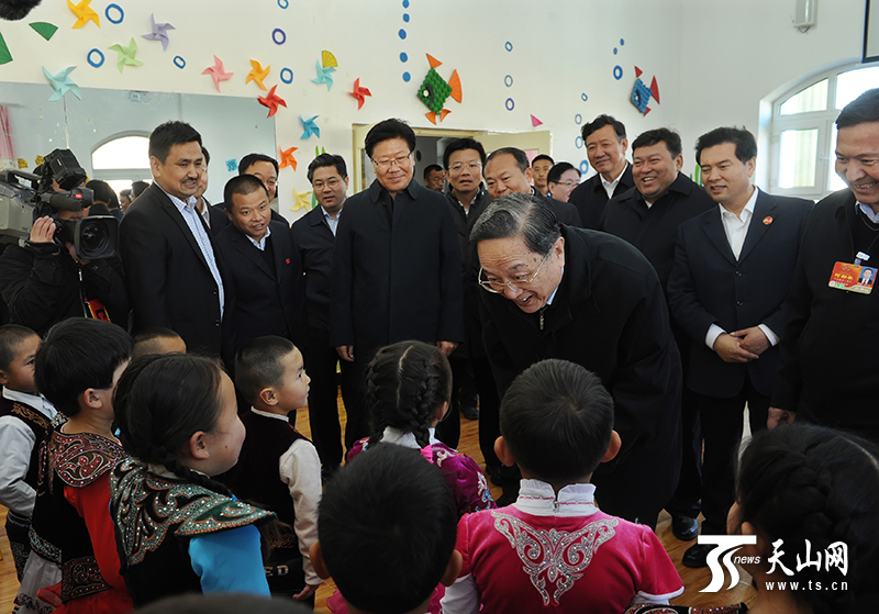 9月29日,中共中央政治局常委、全国政协主席、中央代表团团长俞正声率中央代表团部分成员在阿勒泰地区看望慰问各族干部群众。这是俞正声在布尔津县窝依莫克乡也拉曼牧民定居新村幼儿园听小朋友唱儿歌。 新疆日报记者 卢民一摄