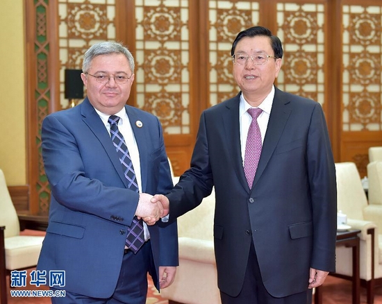 10月14日,中共中央政治局常委、全国人大常委会委员长张德江在北京人民大会堂会见前来参加亚洲政党丝绸之路专题会议的格鲁吉亚议长乌苏帕什维利。新华社记者李涛摄