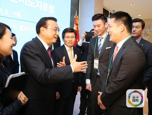 11月2日上午,克强总理启程回国前出席中韩青年领导者论坛,与宁泽涛、韩庚、常昊等中韩青年代表亲切交流。