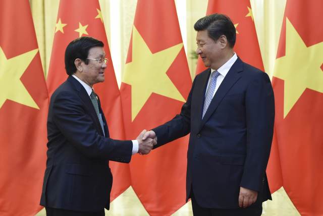 2015年9月3日,国家主席习近平在北京人民大会堂会见越南国家主席张晋创。新华社记者张铎摄