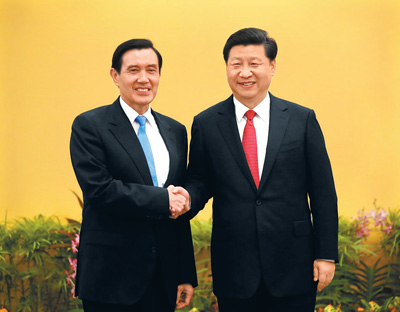11月7日下午,中共中央总书记、国家主席习近平同台湾方面领导人马英九在新加坡会面,就进一步推进两岸关系和平发展交换意见。这是习近平同马英九握手。