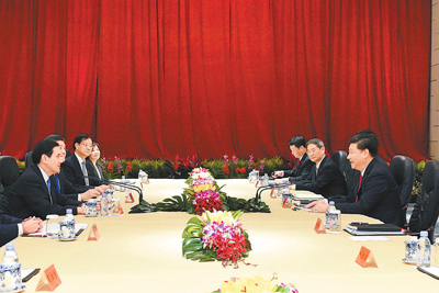 11月7日下午,中共中央总书记、国家主席习近平同台湾方面领导人马英九在新加坡会面,就进一步推进两岸关系和平发展交换意见。这是习近平同马英九在交谈。