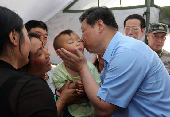 2013年5月21日,四川芦山地震灾区,习近平总书记在芦山县体育馆安置点一帐篷内亲抚一个小孩。新华社记者兰红光摄