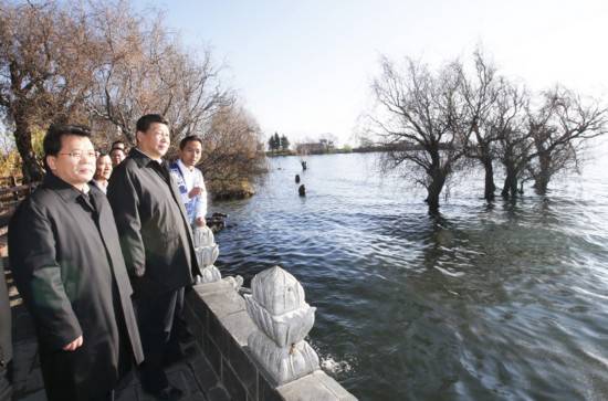2015年1月20日,习近平来到大理白族自治州大理市湾桥镇古生村,仔细察看洱海边的生态保护湿地。新华社记者 鞠鹏 摄