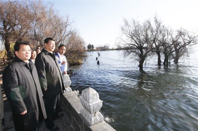 习近平来到大理白族自治州大理市湾桥镇古生村,仔细察看洱海边的生态保护湿地。 新华社记者 鞠鹏 摄