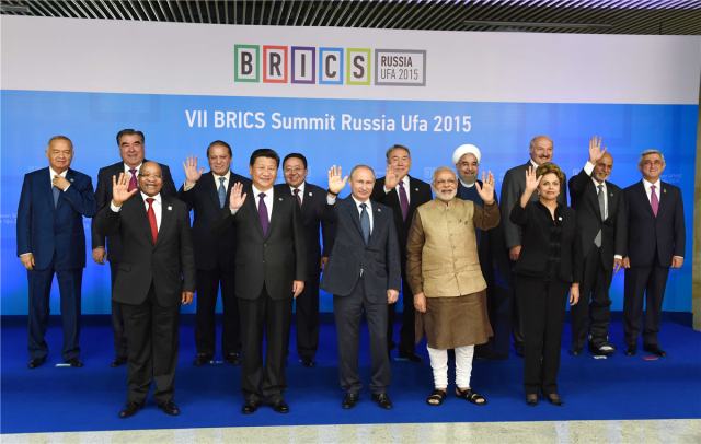 7月9日,金砖国家同欧亚经济联盟、上海合作组织成员国、观察员国及受邀国领导人对话会在俄罗斯乌法举行。新华社记者饶爱民 摄