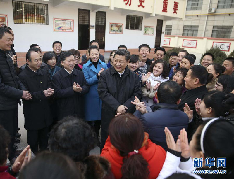 这是14日上午,习近平在延安市杨家岭福州希望小学视察后,与闻讯赶来的附近群众亲切交流并向大家拜年。 新华社记者 兰红光 摄