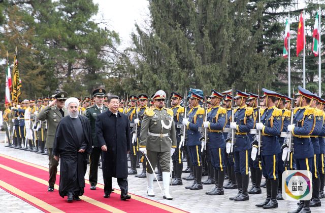 1月23日,国家主席习近平同伊朗总统鲁哈尼在德黑兰萨德阿巴德王宫举行会谈。这是会谈前,习近平主席出席鲁哈尼总统举行的隆重欢迎仪式。(新华社记者马占成摄)