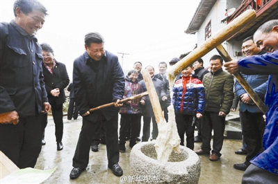在茅坪乡神山村,红军烈士后代左秀发一家正在准备年货。总书记来到他家门前,拿起木槌,同村民一起打糍粑