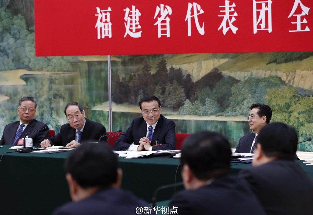 新华社北京3月7日电 李克强7日参加十二届全国人大四次会议福建代表团全体会议。来自平潭的代表兴奋地告诉总理,福建自贸区平潭片区挂牌后,推进建设两岸共同家园,许多台湾同胞来此投资兴业居住购物。他们口中“我爱平潭”已变为“爱我平潭”。