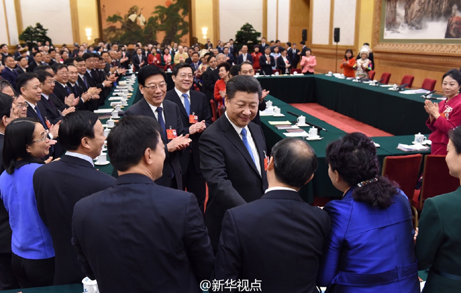 8日上午,习近平参加湖南代表团审议。正值三八国际劳动妇女节,总书记代表党中央、国务院,向女代表、女委员、女工作人员和全国各族各界妇女致以节日的祝贺和诚挚的祝福。会议结束时,习近平同代表们握手道别。女代表纷纷围拢过来,向总书记表示感谢。习近平再次向妇女同胞表示祝贺。(新华视点微博 新华社记者霍小光,摄影兰红光、饶爱民)