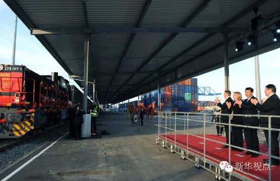 2014年3月29日,国家主席习近平参观德国北威州杜伊斯堡港。这是习近平观看重庆至杜伊斯堡港的“渝新欧”铁路列车到达。(新华社记者 饶爱民 摄)