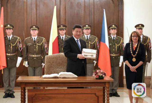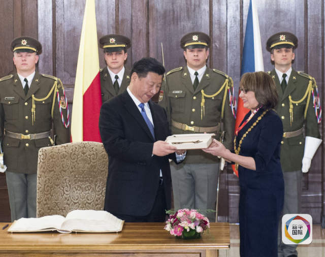 3月29日,国家主席习近平在捷克布拉格会见布拉格市长科尔娜乔娃,并接受科尔娜乔娃代表该市赠予的城市钥匙。(新华社记者庞兴雷摄)