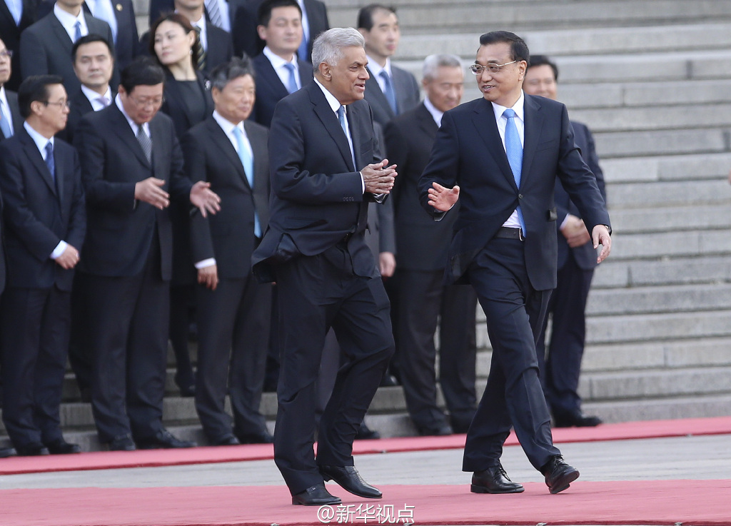 新华网北京4月7日电 国务院总理李克强7日下午在人民大会堂东门外广场举行仪式,欢迎来华进行正式访问的斯里兰卡总理维克勒马辛哈。(新华社“新华视点”微博报道)