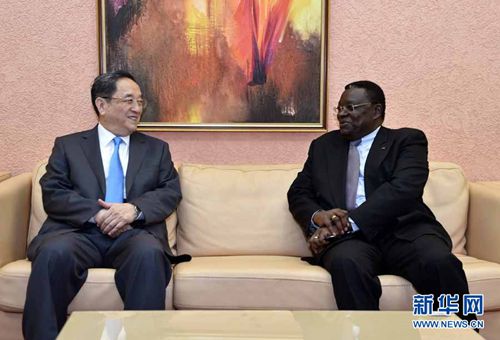 4月12日,正在加蓬进行正式友好访问的全国政协主席俞正声在利伯维尔会见加蓬国民议会议长奥努维耶。 新华社记者高洁摄