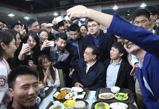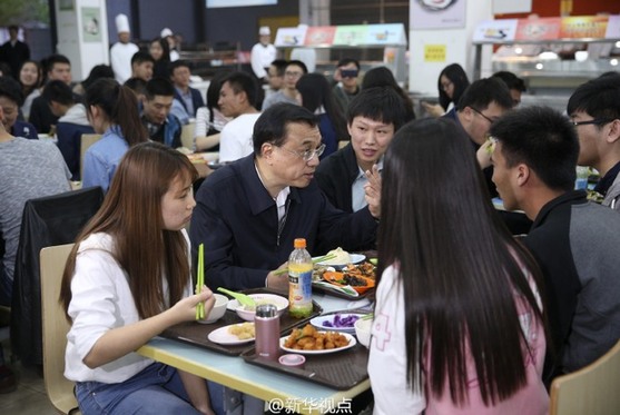 【李克强在北大食堂与学生一起就餐】15日傍晚,当李克强出现在北大农园食堂时,整个大厅气氛顷刻达到沸点,同学们争相上前与总理握手、拍照。李克强端着餐盘选好菜后坐到学生中间。从食堂菜价贵不贵到国家助学金够不够用,从宿舍住宿条件到同学们的论文选题,总理兴致勃勃与大家边吃边聊了半个多小时。(新华社“新华视点”微博报道)