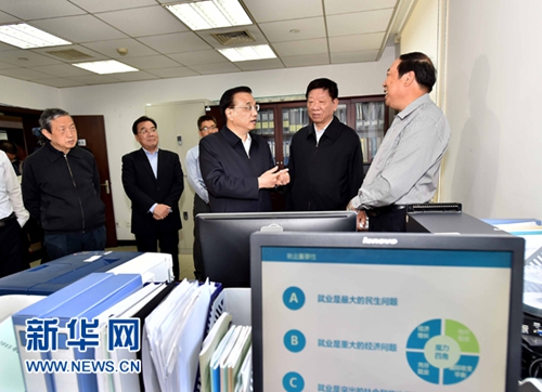 5月6日,中共中央政治局常委、国务院总理李克强到人力资源社会保障部考察并主持召开就业工作座谈会。这是李克强在就业促进司仔细了解就业信息监测及形势分析。 新华社记者李涛摄