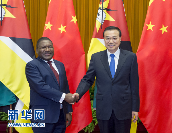 李克强表示,中莫建交以来,两国关系健康稳定发展。昨天,习近平主席同你举行了富有成果的会谈,双方签署了一系列合作文件。中方支持莫桑比克为维护国家安全、促进民族和解所作努力,愿为莫桑比克经济发展和民生改善提供力所能及的帮助。