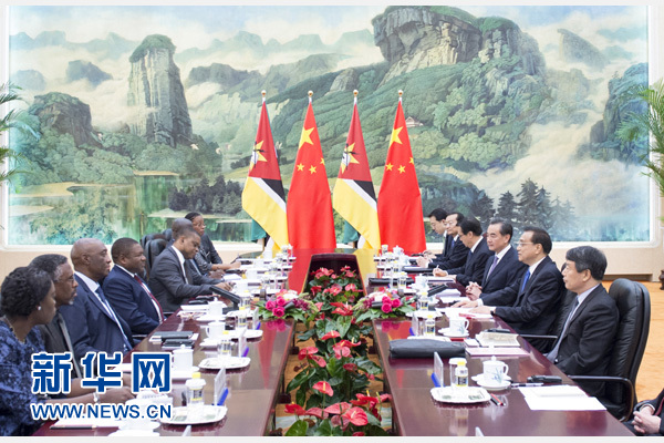5月19日,国务院总理李克强在北京人民大会堂会见来华进行国事访问的莫桑比克总统纽西。 新华社记者 王晔 摄
