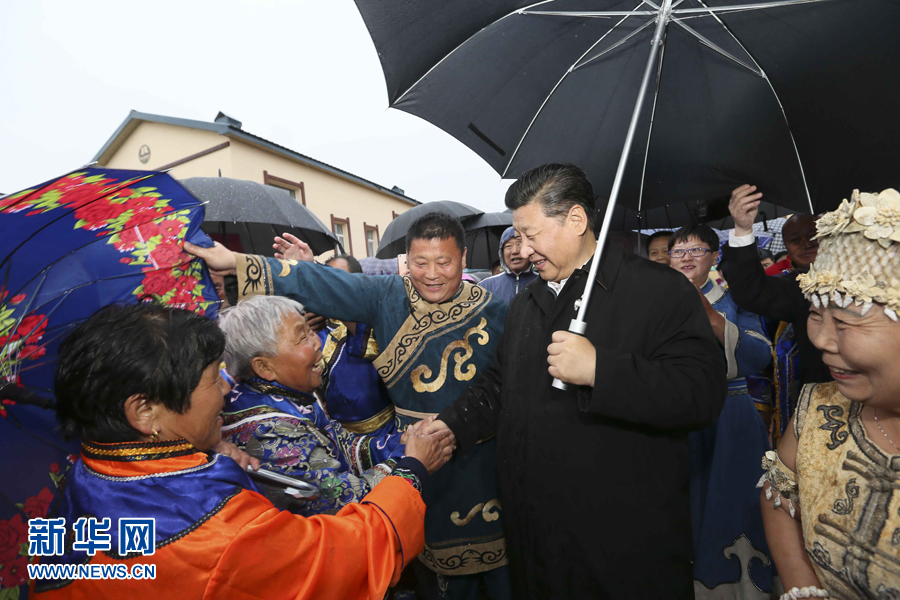 图为:2016年5月23日至25日,中共中央总书记、国家主席、中央军委主席习近平在黑龙江考察调研。这是5月24日下午,习近平在佳木斯市同江市八岔赫哲族乡八岔村冒雨与村民们交谈。