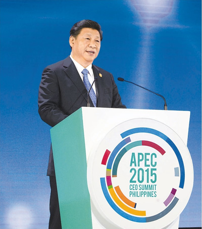 图为:2015年11月18日,国家主席习近平在菲律宾马尼拉出席亚太经合组织工商领导人峰会并发表主旨演讲。