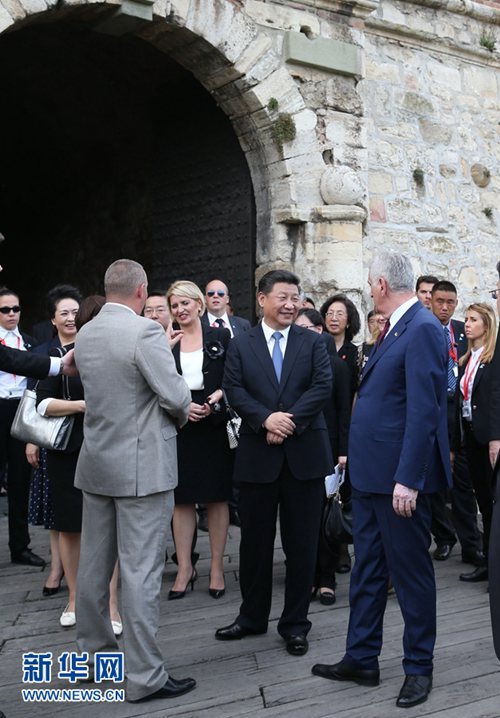 6月17日,中国国家主席习近平和夫人彭丽媛在塞尔维亚总统尼科利奇夫妇陪同下参观具有悠久历史的贝尔格莱德卡莱梅格丹公园。 新华社记者 马占成 摄
