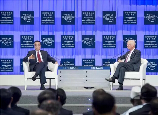 2014年9月10日,国务院总理李克强在天津梅江会展中心出席第八届夏季达沃斯论坛开幕式,并发表特别致辞。这是致辞后,李克强总理回答世界经济论坛主席施瓦布关于中国经济问题的提问。 新华社记者 王晔 摄