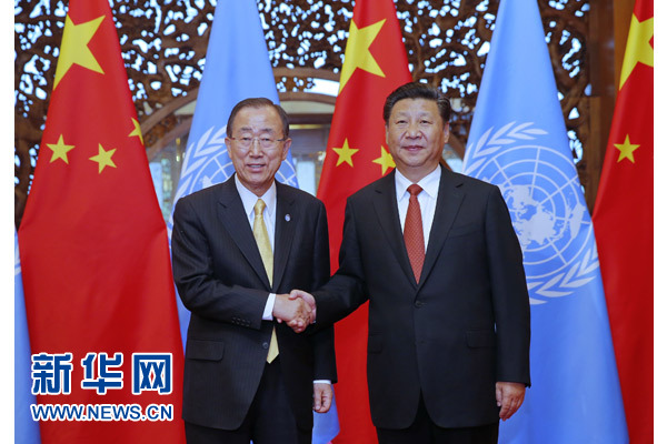 习近平欢迎潘基文出席9月二十国集团领导人杭州峰会。习近平指出,中方高度重视并同联合国在发展和气候变化等问题上开展了密切合作,取得了重要进展。中方推动二十国集团领导人峰会聚焦发展问题,推动共建“一带一路”,就是要助力2030年可持续发展议程。中方倡导设立亚投行,并愿同联合国、世界银行等国际组织加强合作,就是要同世界各国分享中国的发展机遇。