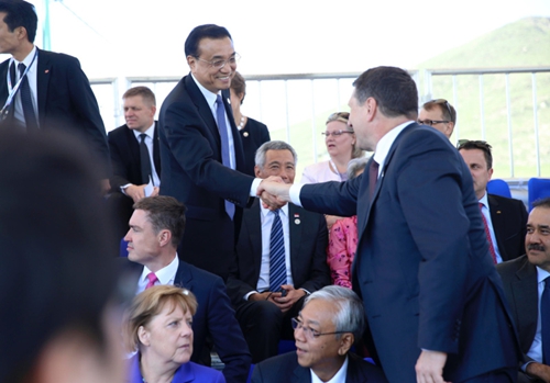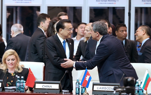 7月15日上午,第十一届亚欧首脑会议上,李克强总理与克罗地亚总统基塔罗维奇握手交谈。新华社 马占成 摄