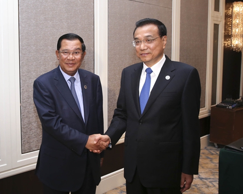7月15日上午,李克强总理会见柬埔寨首相洪森。洪森表示,柬方在南海问题上将坚持客观公正立场,支持直接当事国通过对话协商解决具体争议。新华社 庞兴雷 摄