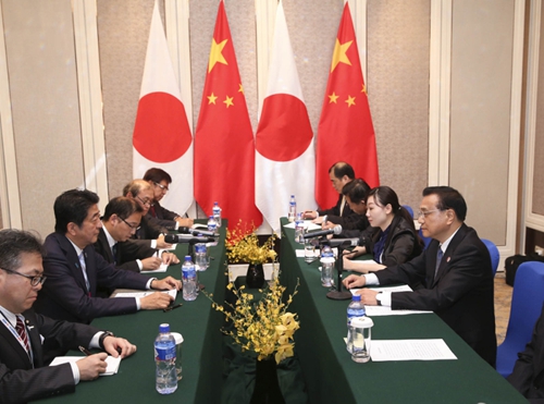 7月15日下午,李克强总理应约会见日本首相安倍晋三时表示,在南海问题上,日方作为非当事国,应谨言慎行,不要炒作和介入。新华社 庞兴雷 摄