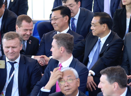 7月15日下午,李克强总理在那达慕贵宾看台上,隔着蒙古国总理额尔登巴特,与俄罗斯总理梅德韦杰夫握手交流。此前双方会见时,梅表示,俄方尊重中方原则立场,支持由直接当事方通过双边友好协商解决南海争端,反对域外势力干预,反对南海问题国际化。中新社 刘震 摄
