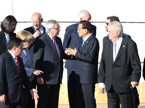7月16日上午,出席亚欧首脑会议非正式会议时,李克强总理与欧盟委员会主席容克重逢。两位老友4天前刚刚在北京举行过会晤。新华社 马占成 摄