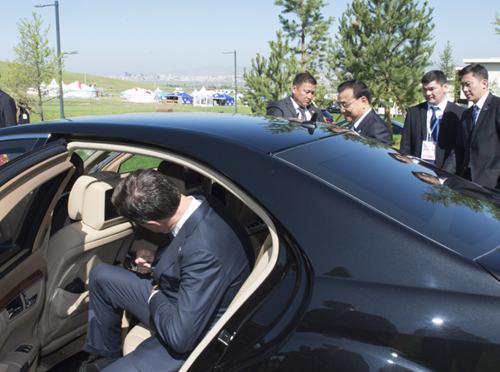 7月16日上午,李克强总理打破惯例,邀请荷兰首相吕特与自己同车前往亚欧首脑会议闭幕式会场。新华社 王晔 摄